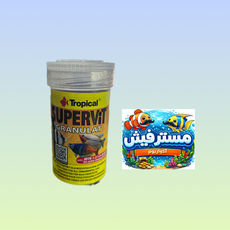 غذاماهی آکواریوم تروپیکال(گرانول حاوی بتاگلوکان و اسپیرولینا و ویتامینC)حجم55ml